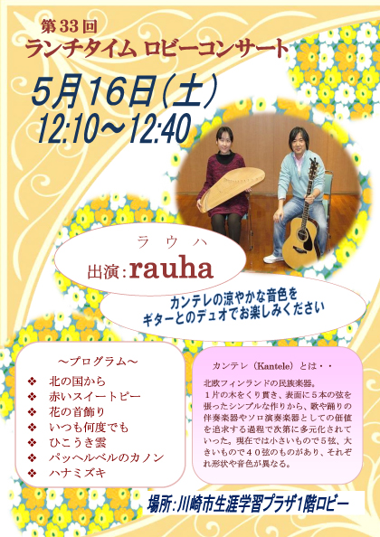 ギターとカンテレという北欧の楽器で「いつも何度でも」や「赤いスイートピー」など、奏でてくださいました。カンテレの透明感のある美しい音色に心が潤され感動されている方も多くいらっしゃいました。