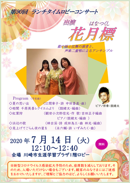 出演:花月標(はなつくし)/ 鈴木雅子(ソプラノ)・大月多美子(メゾソプラノ)・吉田正子(仕舞い・謡・編曲)、鼓緒太(ピアノと編曲)